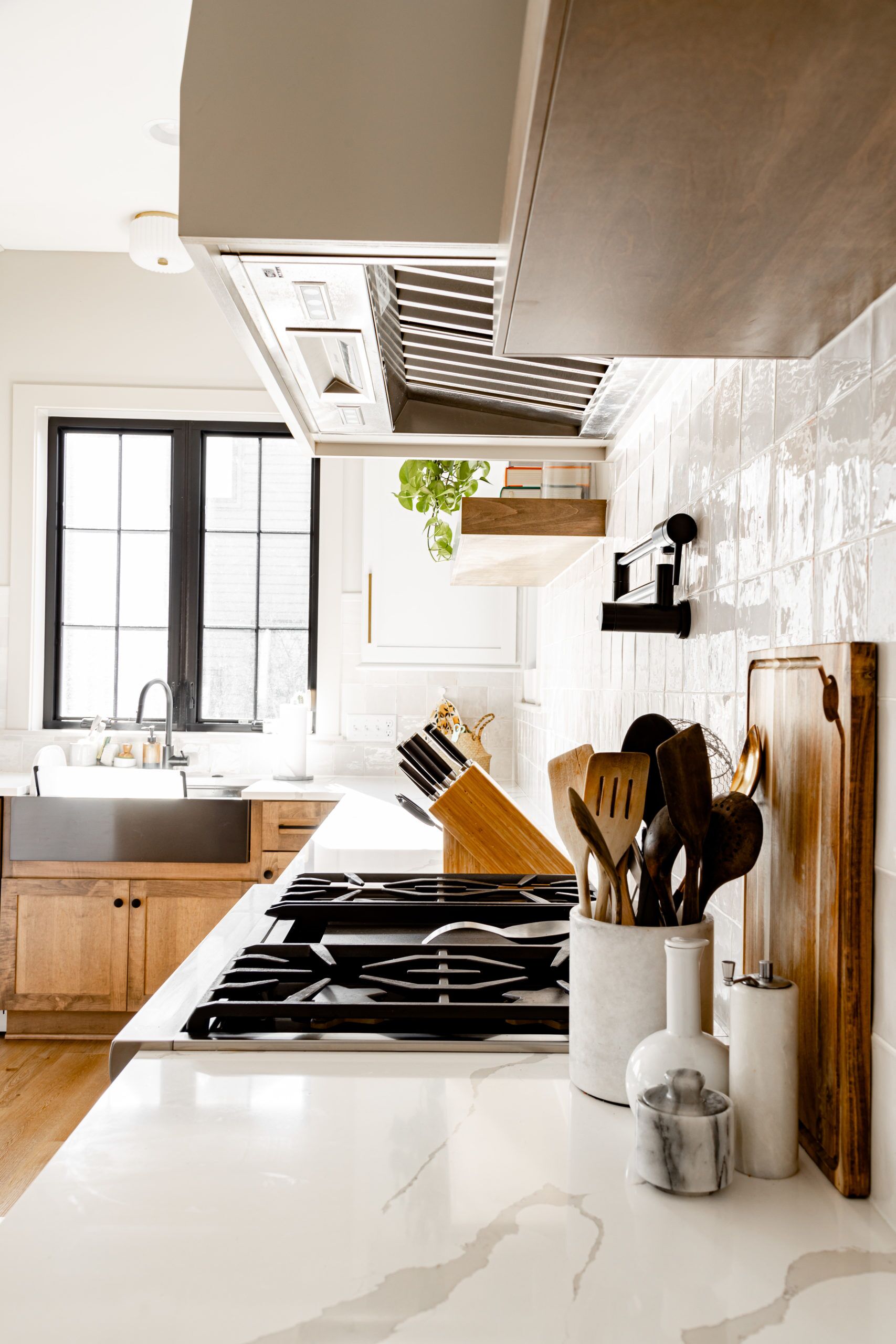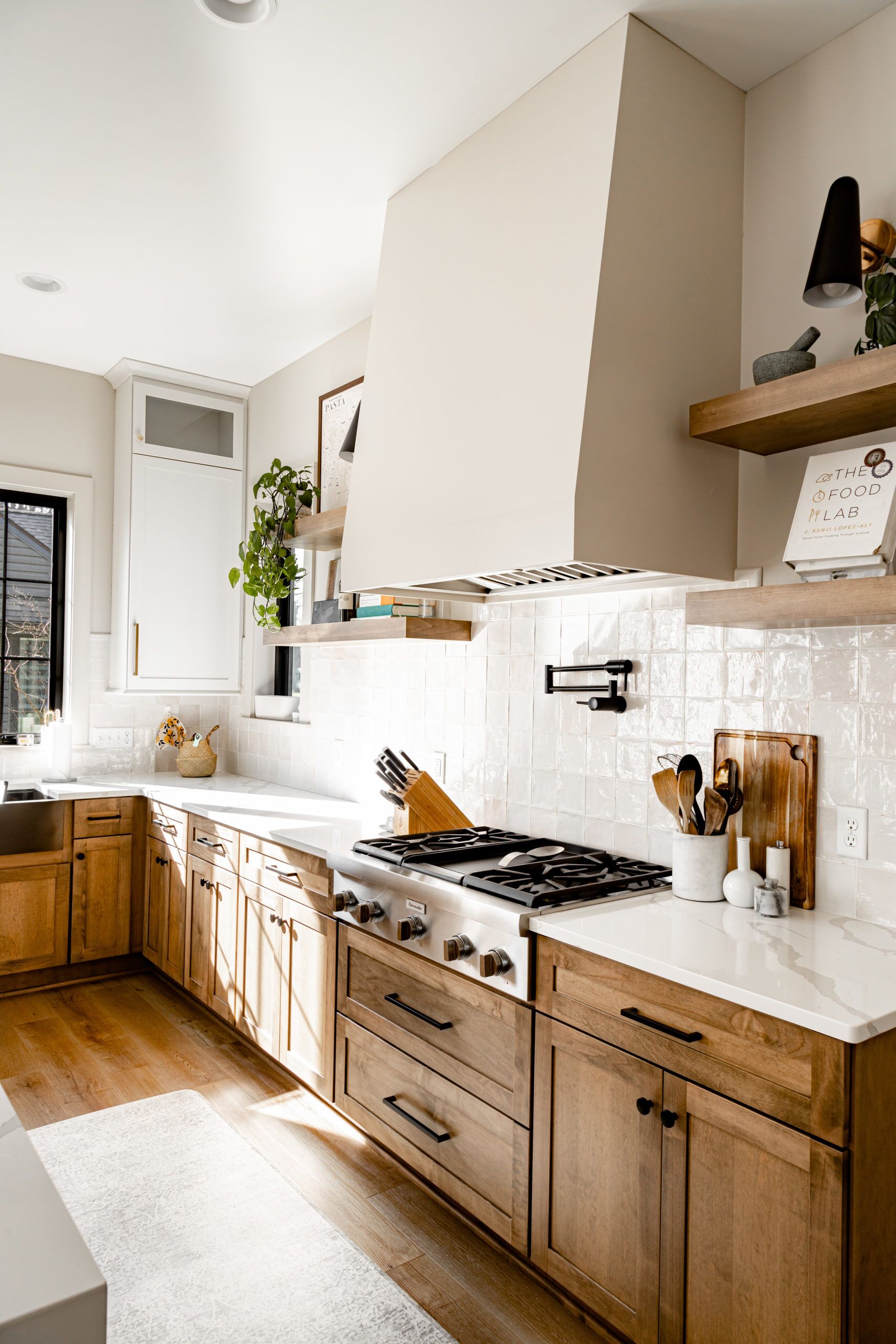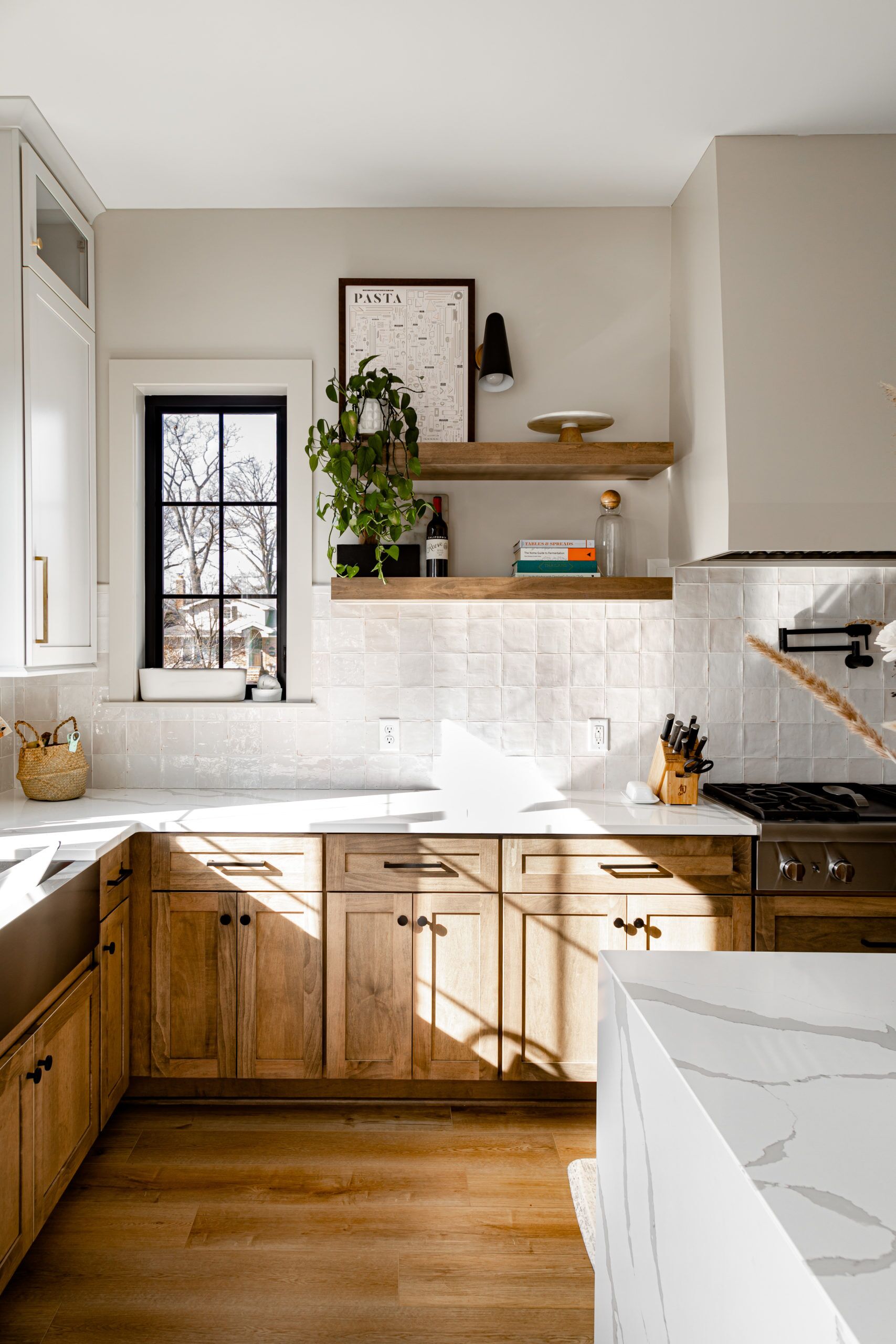 This kitchen not only delivers on style with an open concept design but also solves the dilemma of where to hide the mess while entertaining with its expansive back kitchen. The island is the centerpiece of the space, with its unique sit-in area perfect for quick meals or a place to chat with guests while you cook. The gas range is equipped with a pot filler which makes cooking pasta a breeze! The natural wood grained cabinets add the touch of warmth to the space while the white quartz countertops create a striking contrast, giving the kitchen a modern feel. And when it comes to dining, forget the formal room - this home's open concept design seamlessly blends the kitchen and dining area into one stunning space.