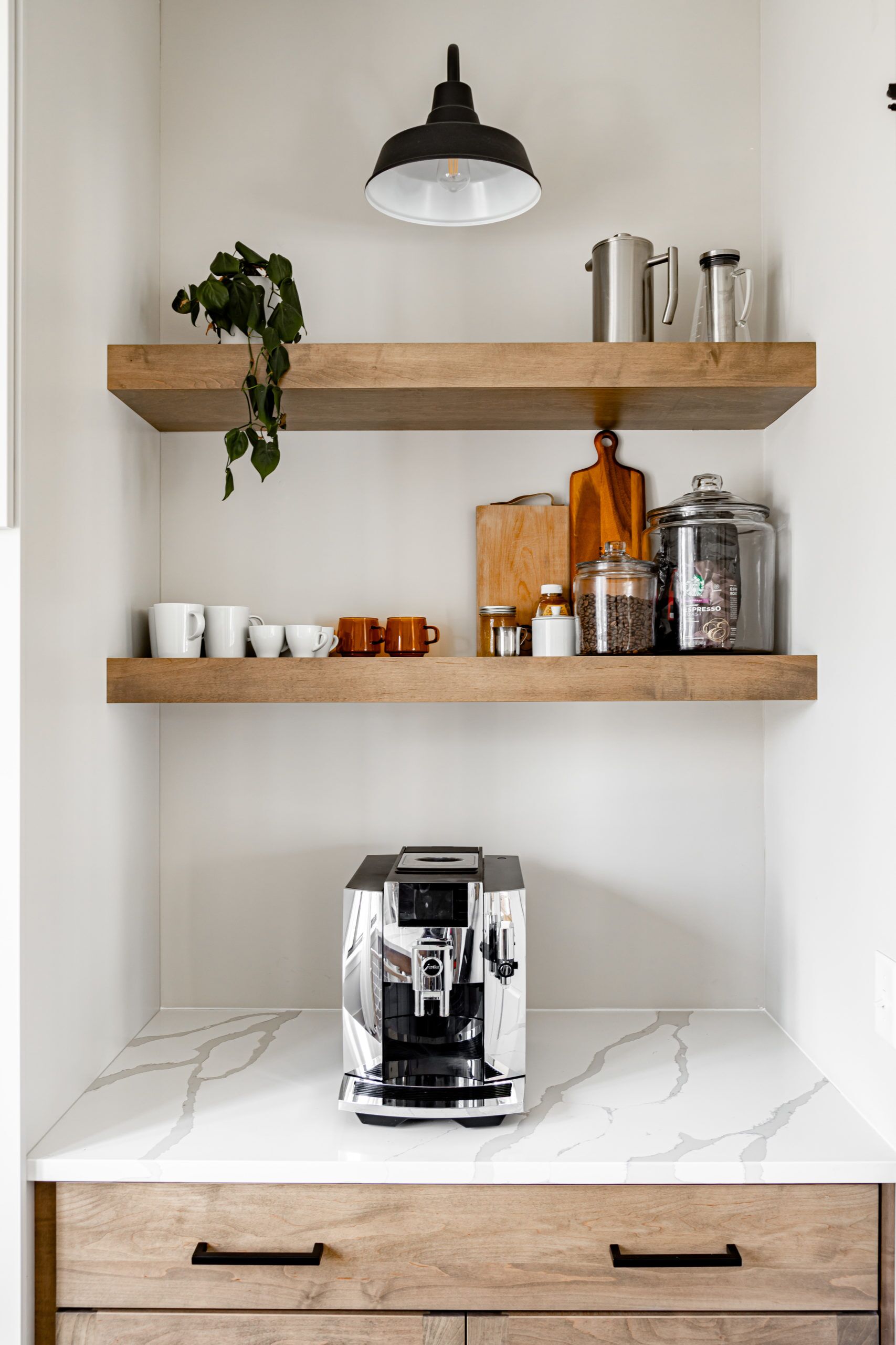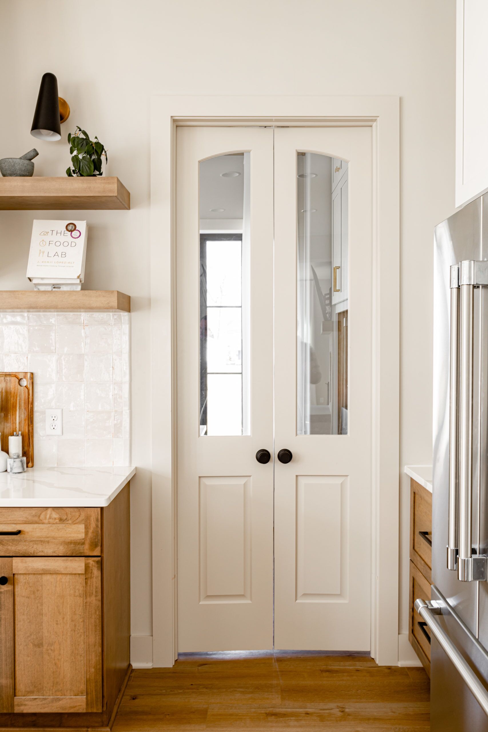 A scullery, known by many names like "back kitchen," "Butler's pantry," or "messy kitchen," is a separate area in a home used for preparing and cleaning up after meals. This space is a functional necessity in open kitchen designs to allow for extra storage, prep sinks, and to hide countertop appliances. This scullery is accessed through a pair of elegant glass-paned French doors, leading into a space that is both practical and aesthetically pleasing. The highlight of the scullery is the island, which not only provides additional counter space but also serves as a hiding place for cooking messes. The floating shelves on the walls add to the practicality of the scullery, providing a designated coffee bar and mug storage.
