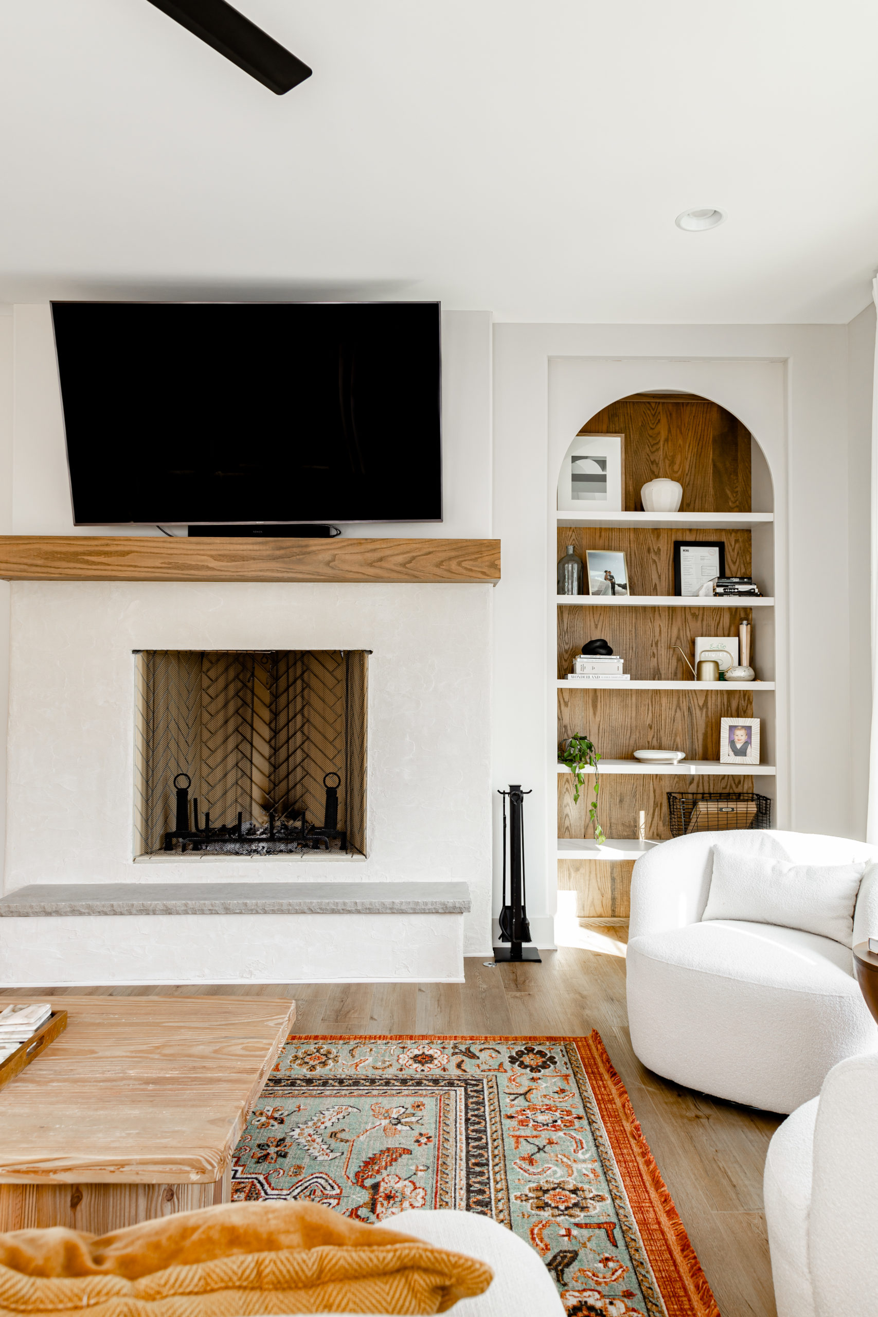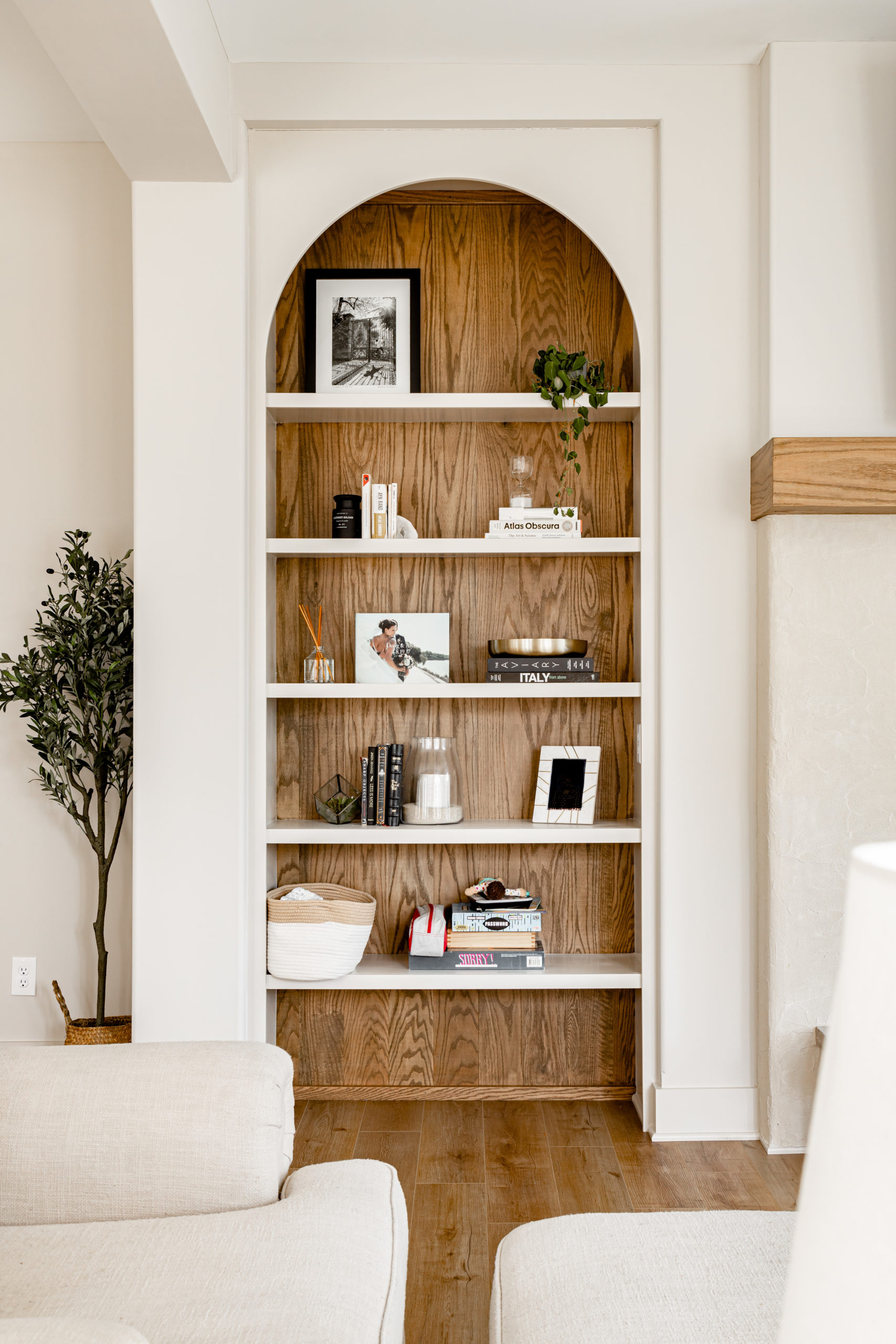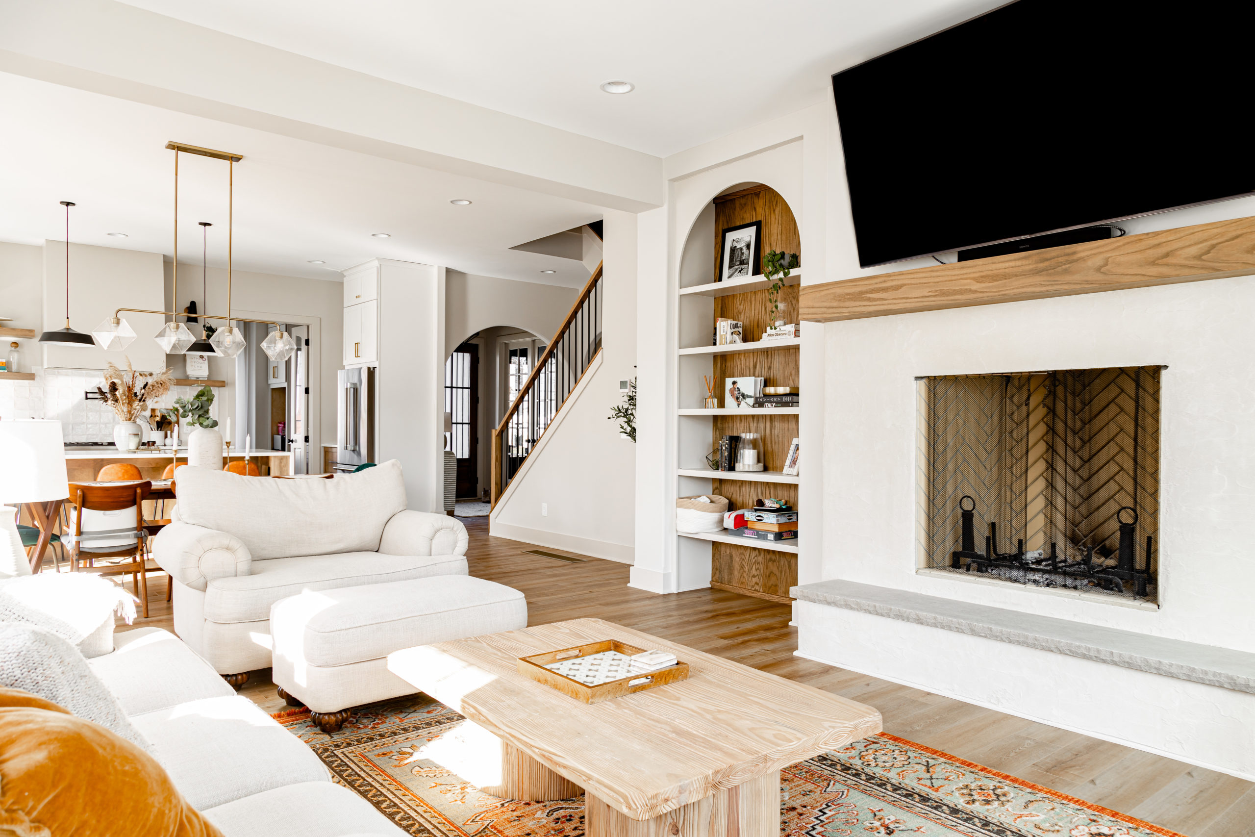 Our favorite theme throughout the interior of the home is the casual warmth that makes you instantly feel calm. In the Great Room the first thing you'll notice are the beautifully crafted built-in cabinets, mirrored on both sides of the fireplace, complete with arched tops that add a touch of sophistication to the room. The natural wood grain paneling on the backs of the shelves offers a striking contrast to the neutral wall color, creating a sense of warmth and depth. With its ten-foot ceilings and ample windows, the great room is perfect for entertaining guests, while still providing a cozy space for relaxation and quality family time. This room is the epitome of luxury living, where design meets functionality in the most perfect way possible.