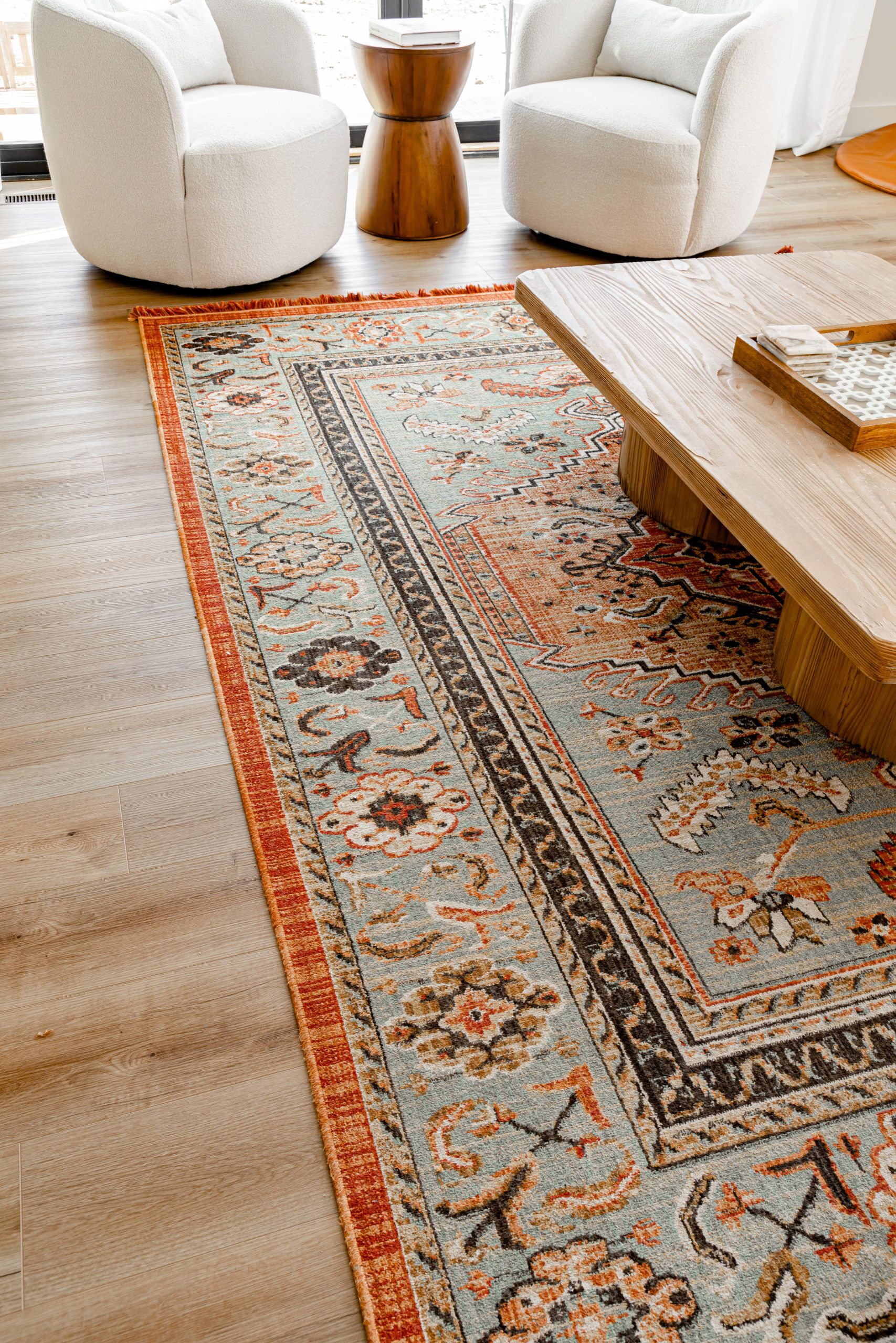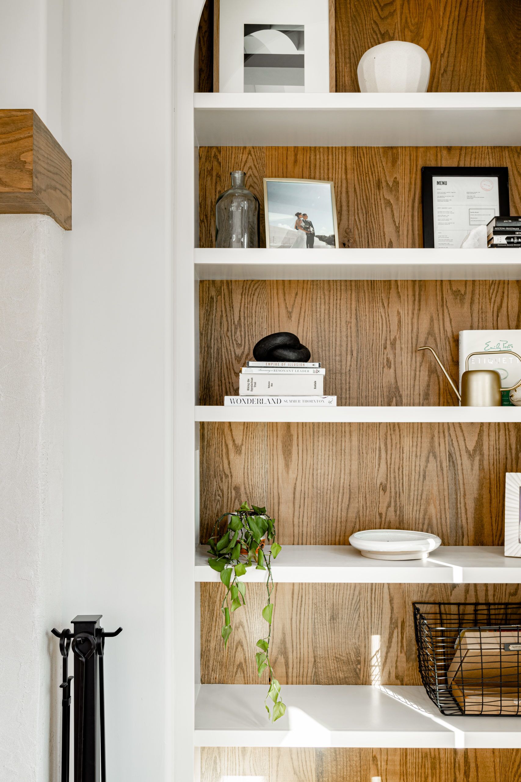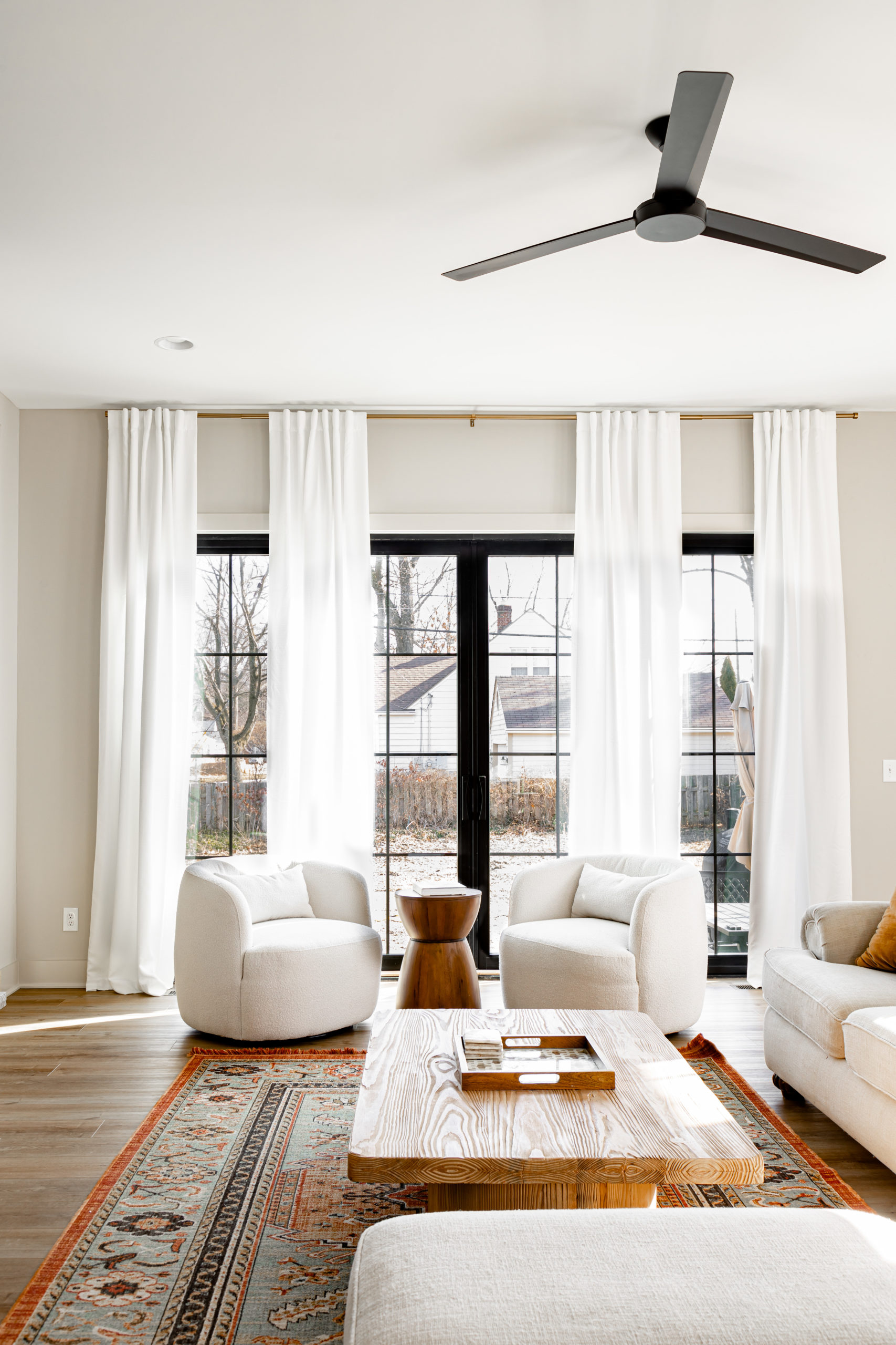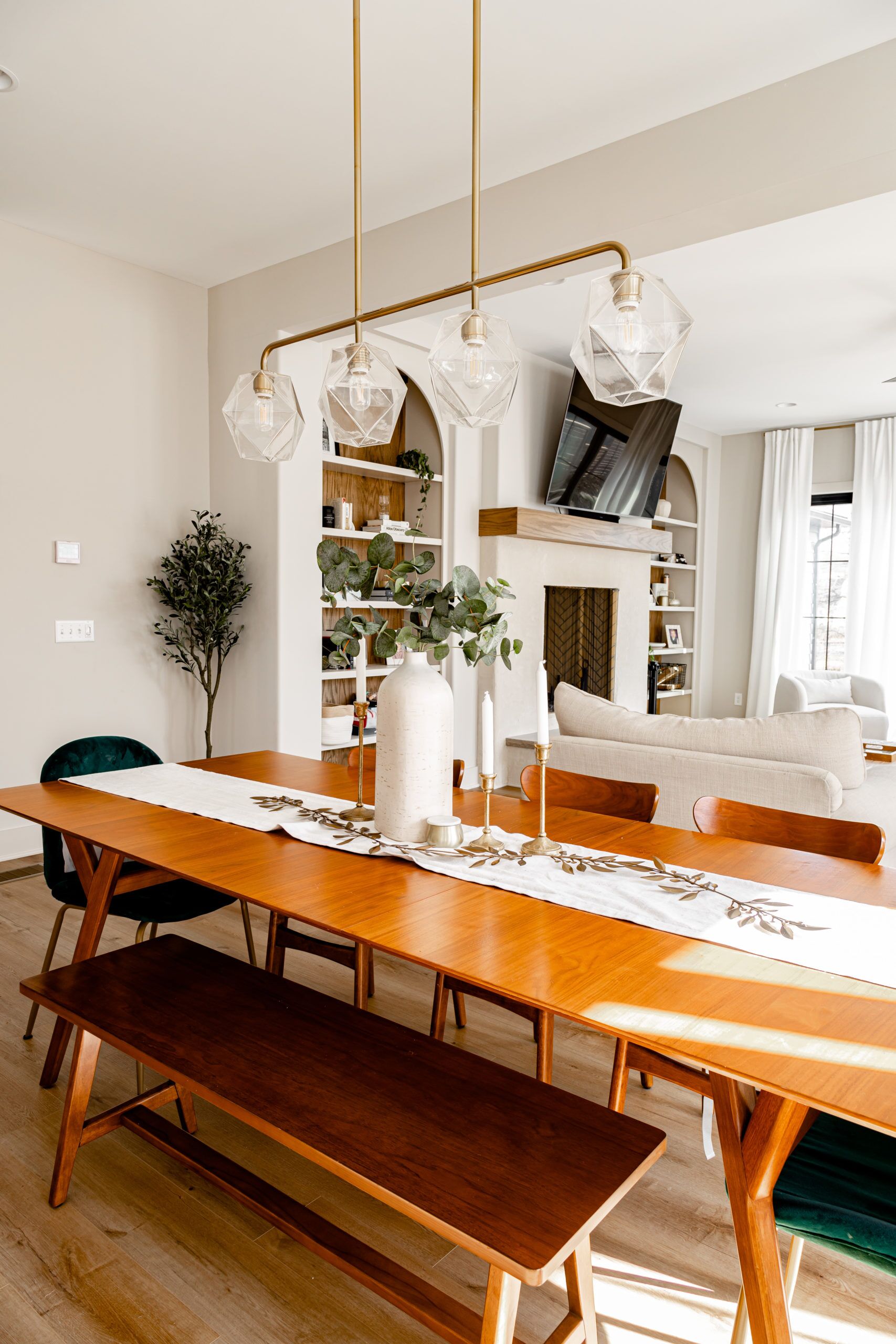 Our favorite theme throughout the interior of the home is the casual warmth that makes you instantly feel calm. In the Great Room the first thing you'll notice are the beautifully crafted built-in cabinets, mirrored on both sides of the fireplace, complete with arched tops that add a touch of sophistication to the room. The natural wood grain paneling on the backs of the shelves offers a striking contrast to the neutral wall color, creating a sense of warmth and depth. With its ten-foot ceilings and ample windows, the great room is perfect for entertaining guests, while still providing a cozy space for relaxation and quality family time. This room is the epitome of luxury living, where design meets functionality in the most perfect way possible.