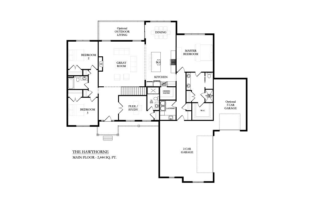 Introducing the Hawthorne, a breath-taking yet traditional ranch home that delivers a spacious open concept with flexible detailing. Enjoy the option of a 3 bedroom with dedicated office or transition to a 4-bedroom home. This floor plan is fit for all your current and future needs!