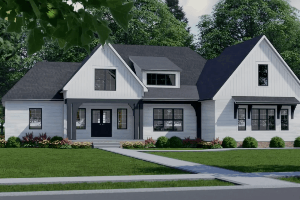 The Hillside Farmhouse is the perfect modern farmhouse Ranch plan! The main living area features an open concept between the kitchen, great room, and dining space that flows to the outside through the central covered porch. The Master Suite and Guest Bedrooms are on opposite sides of the home for optimal privacy.