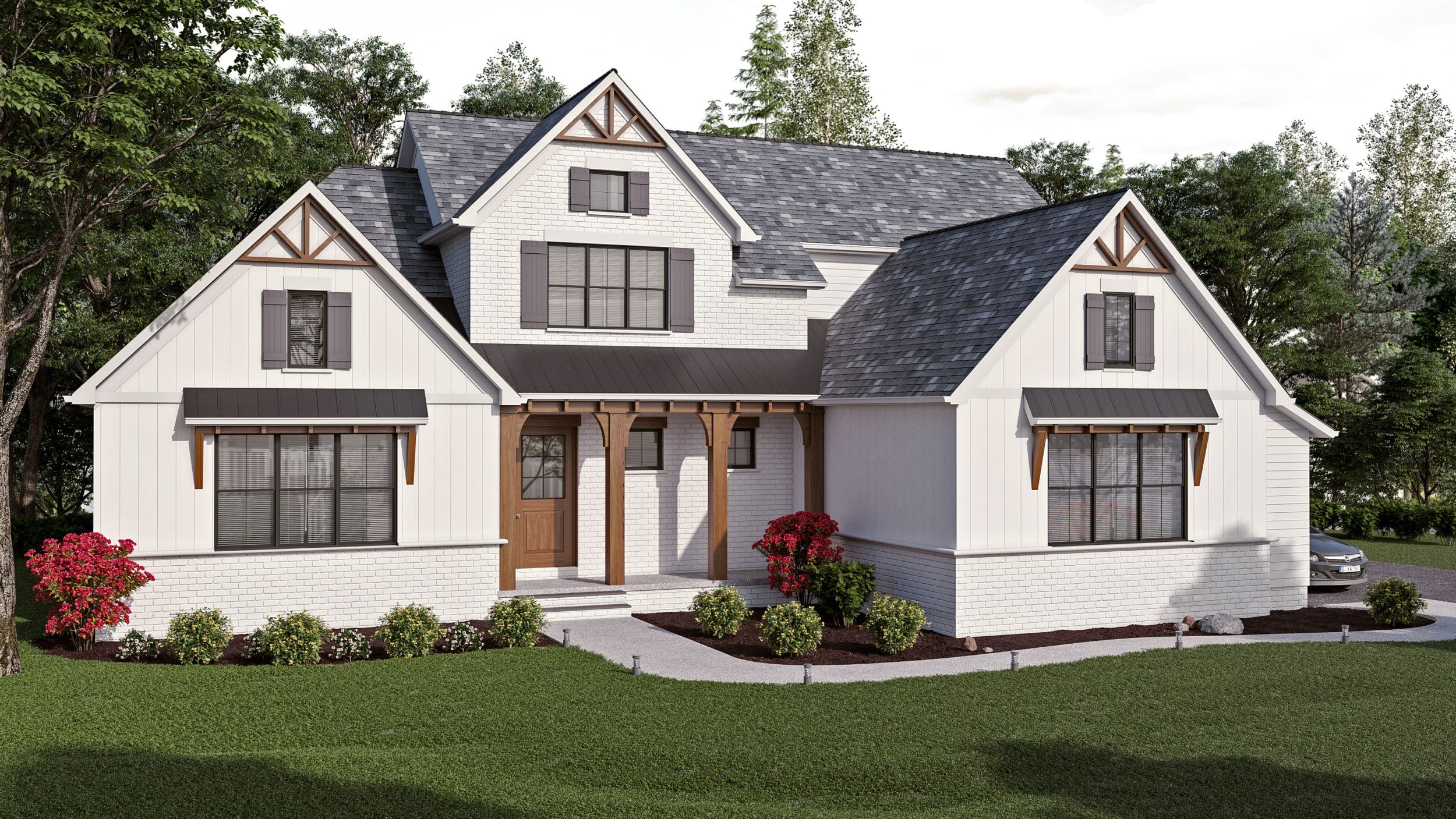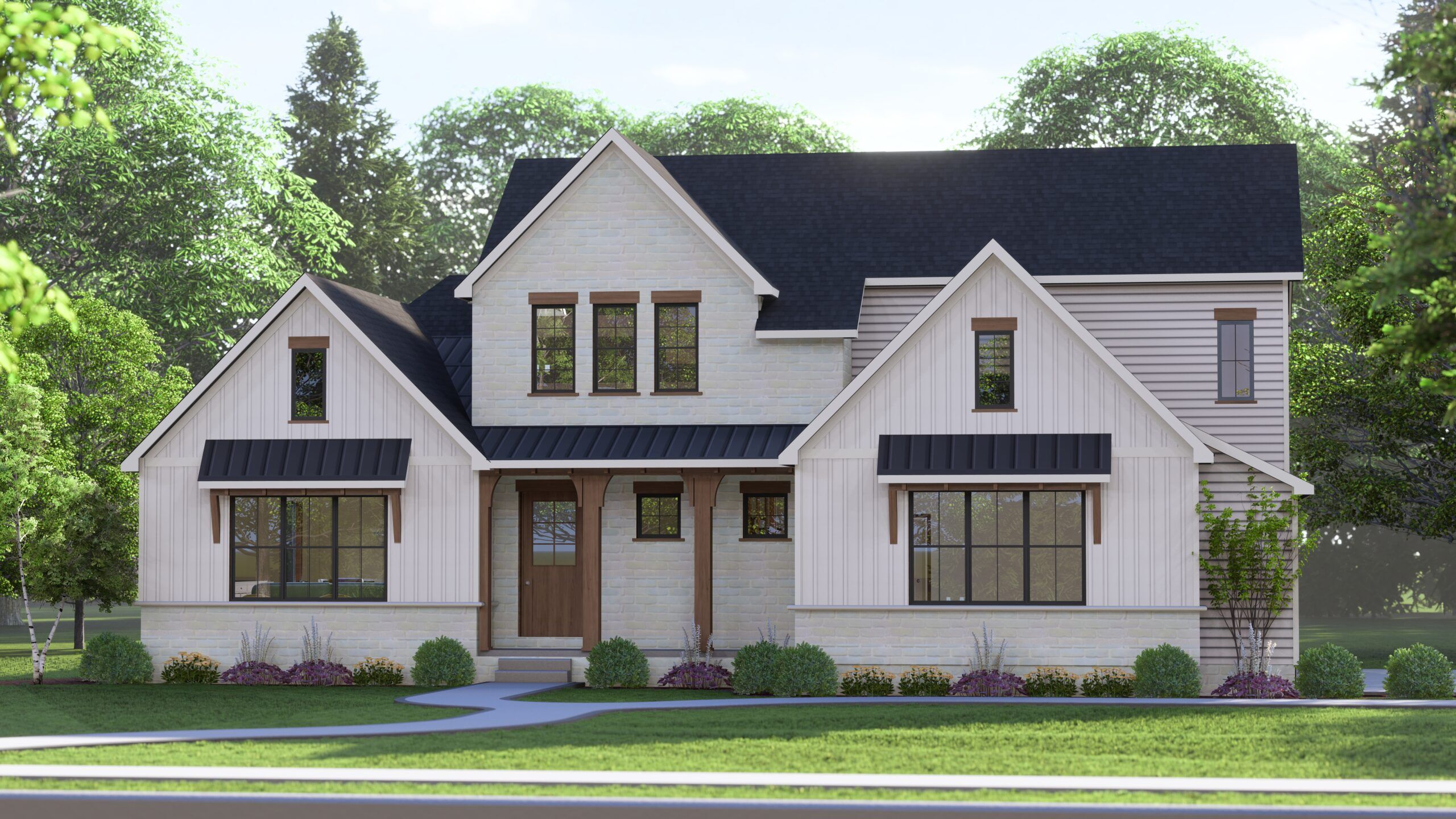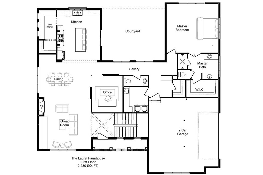 The Laurel Farmhouse takes the modern farmhouse concept to a whole new level with a central outdoor courtyard right off the kitchen and master bedroom. The kitchen with large 12′ sliding doors opens onto this courtyard for your summer cookouts, nighttime marshmallow roasting in the outdoor fireplace, and an early morning coffee right outside your bedroom.
